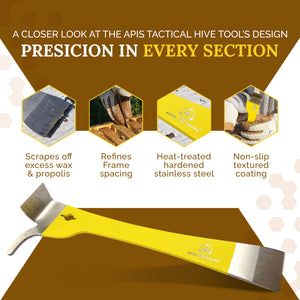 • Enhanced Grip & Control: The Apis Tactical Hive Tool features a non-slip textured handle, givingbee keepers superior control during hive inspections. This ergonomic design reduces hand fatigue and increases efficiency, making it an essential piece ofbee equipment. With its bright yellow coating, it’s easy to locate in your collection ofbee keeping supplies, …or when it inevitably falls on the ground